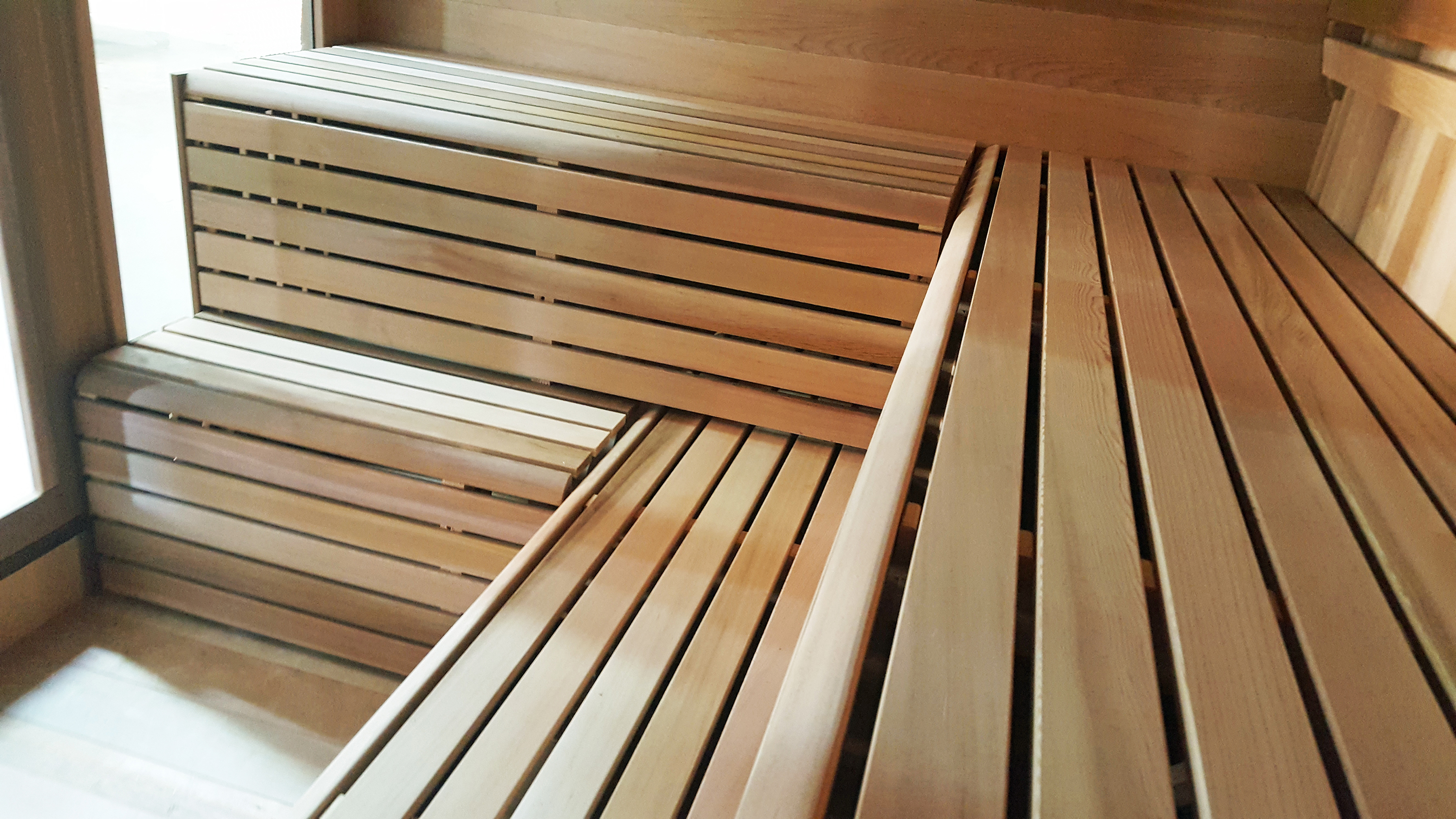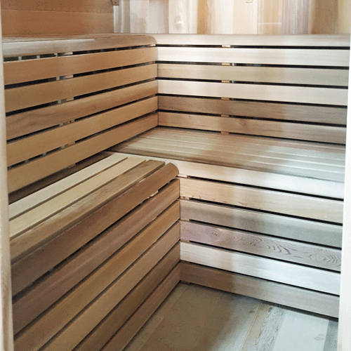 - Two tier benches to sit up high and take advantage of stratiied sauna temperatures. L bench if desired.