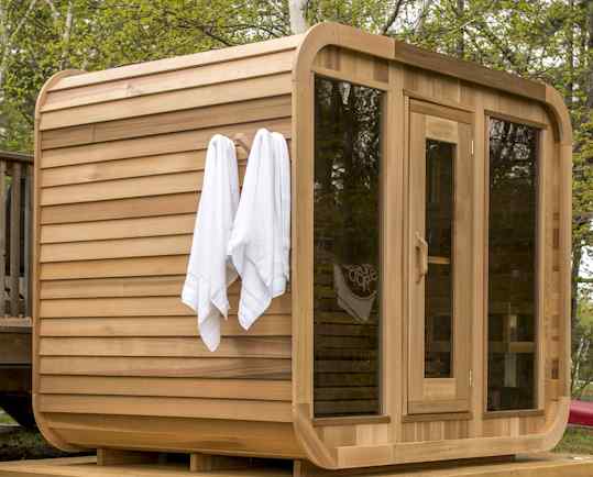 The current craze for outdoor saunas right now are these raindrop shaped saunas. The design comes in different sizes and has additional headspace.